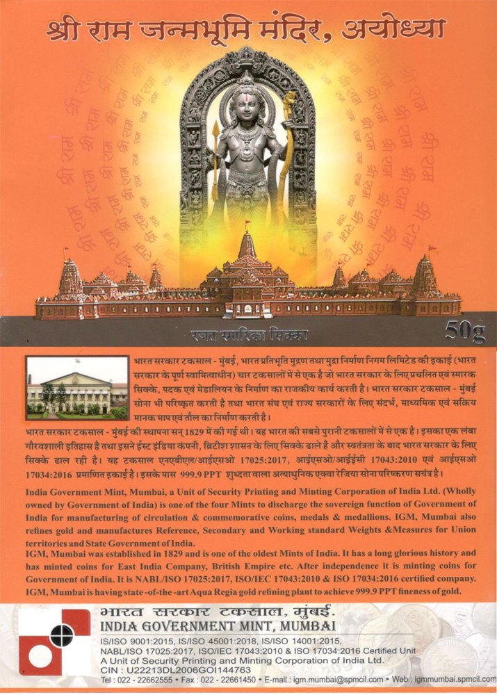 50 Grams Silver Coin - Shree Ram Janmabhoomi Mandir, AyodhyaWg. 50 gramDiameter 50 mmPurity 999Colour Coin