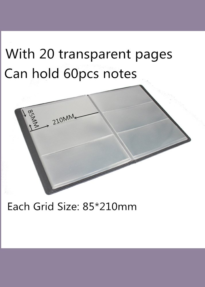 20 transparent hard plastic sheets, free of chemical softeners, each sheet with 3 grids, can hold 60 banknotes.